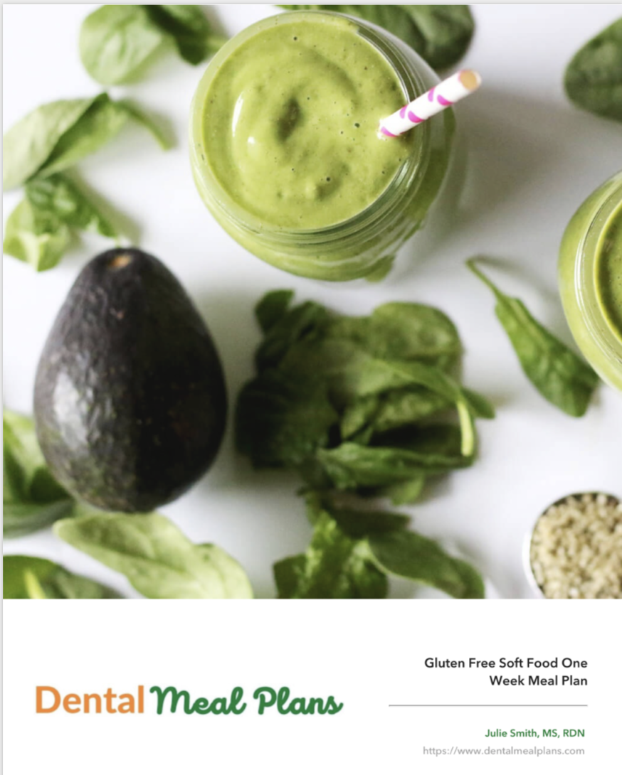 Checkout this 7 day soft food gluten free meal plan filled with nutrients, vitamins and minerals. Meal plan carefully crafted by a registered dietitian specializing in dental health and include a grocery shopping list along with some meal planning tips!